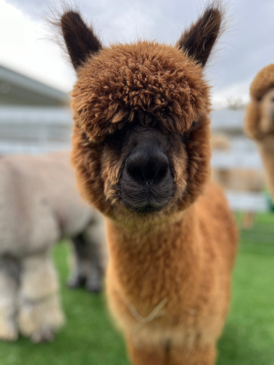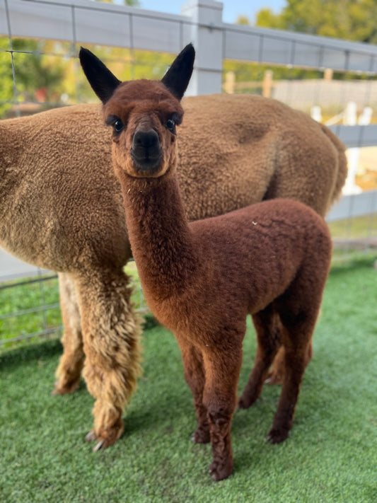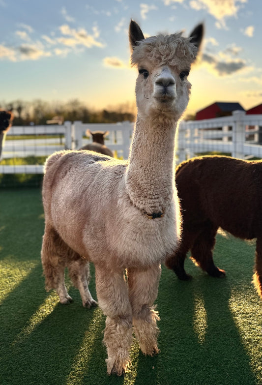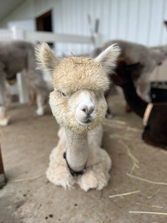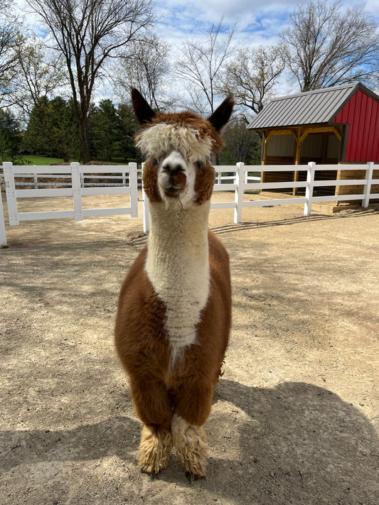 Alpacas are part of the camelid family. They are the smaller and cuter (in our humble opinion 🙂 ) relatives to the llamas. We had a neighbor once describe them as a cross between a giraffe and a poodle. As adults, they weigh between 120-150 pounds. Every year, we shear their fleece. We turn this into roving, mats, hats, socks, gloves. Alpaca fleece is about 5x warmer than sheep wool, is known to wick moisture and is generally hypoallergenic. We are raising high quality show alpacas. We take them to shows around the country where they are judged on many characteristics of their fleece and their conformation. Although they certainly look cuddly, alpacas are more aloof. They are similar to deer in that they are interested in people on their own terms. They are not huge fans of being touched. They are prey animals so with sudden movement, they will run away. However, we spend a great deal of time socializing our animals so that they can become more accustomed to humans so that visitors can enjoy a meaningful interaction with them.Â