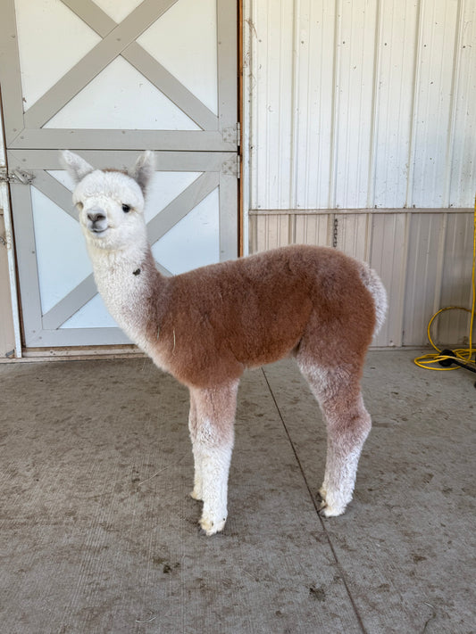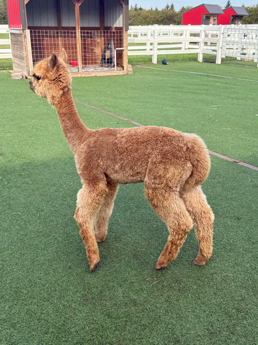 Alpacas are part of the camelid family. They are the smaller and cuter (in our humble opinion 🙂 ) relatives to the llamas. We had a neighbor once describe them as a cross between a giraffe and a poodle. As adults, they weigh between 120-150 pounds. Every year, we shear their fleece. We turn this into roving, mats, hats, socks, gloves. Alpaca fleece is about 5x warmer than sheep wool, is known to wick moisture and is generally hypoallergenic. We are raising high quality show alpacas. We take them to shows around the country where they are judged on many characteristics of their fleece and their conformation. Although they certainly look cuddly, alpacas are more aloof. They are similar to deer in that they are interested in people on their own terms. They are not huge fans of being touched. They are prey animals so with sudden movement, they will run away. However, we spend a great deal of time socializing our animals so that they can become more accustomed to humans so that visitors can enjoy a meaningful interaction with them.Â