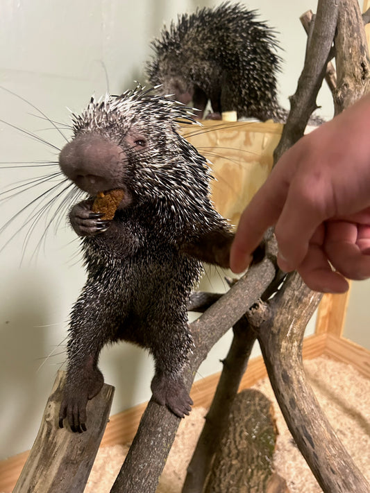 Prehensile tailed porcupines originate from South America. Their tail, predominantly made of muscle, can be used like a 5th appendage. Their tails can measure up to 19 inches long. These adorable creatures can live up to 19 years. They are arboreal, meaning they like to climb and spend their time in trees. They are nocturnal, so they most active at night. However, they are easily woken during the day when we come with treats. They are herbivores and eat mainly root vegetables, nuts, greens, and nutritional biscuits.