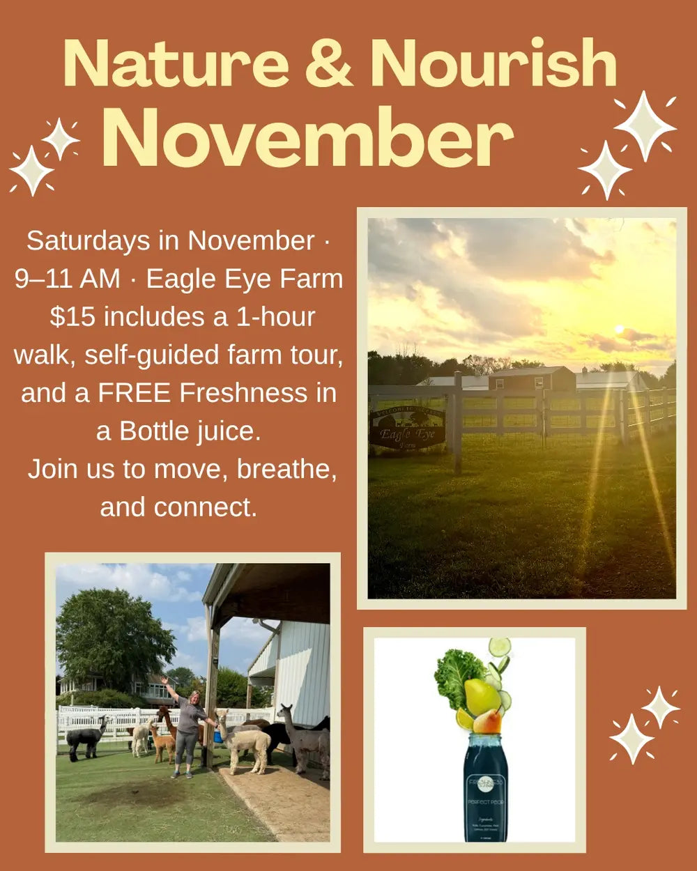 Join us Saturdays in November from 9–11 AM for a relaxing morning at Eagle Eye Farm! Your $15 ticket includes a 1-hour farm walk, a self-guided tour, and a refreshing Freshness in a Bottle juice to top it all off. Your are welcome to stick around longer than 11 am to partake in your self guided tour!