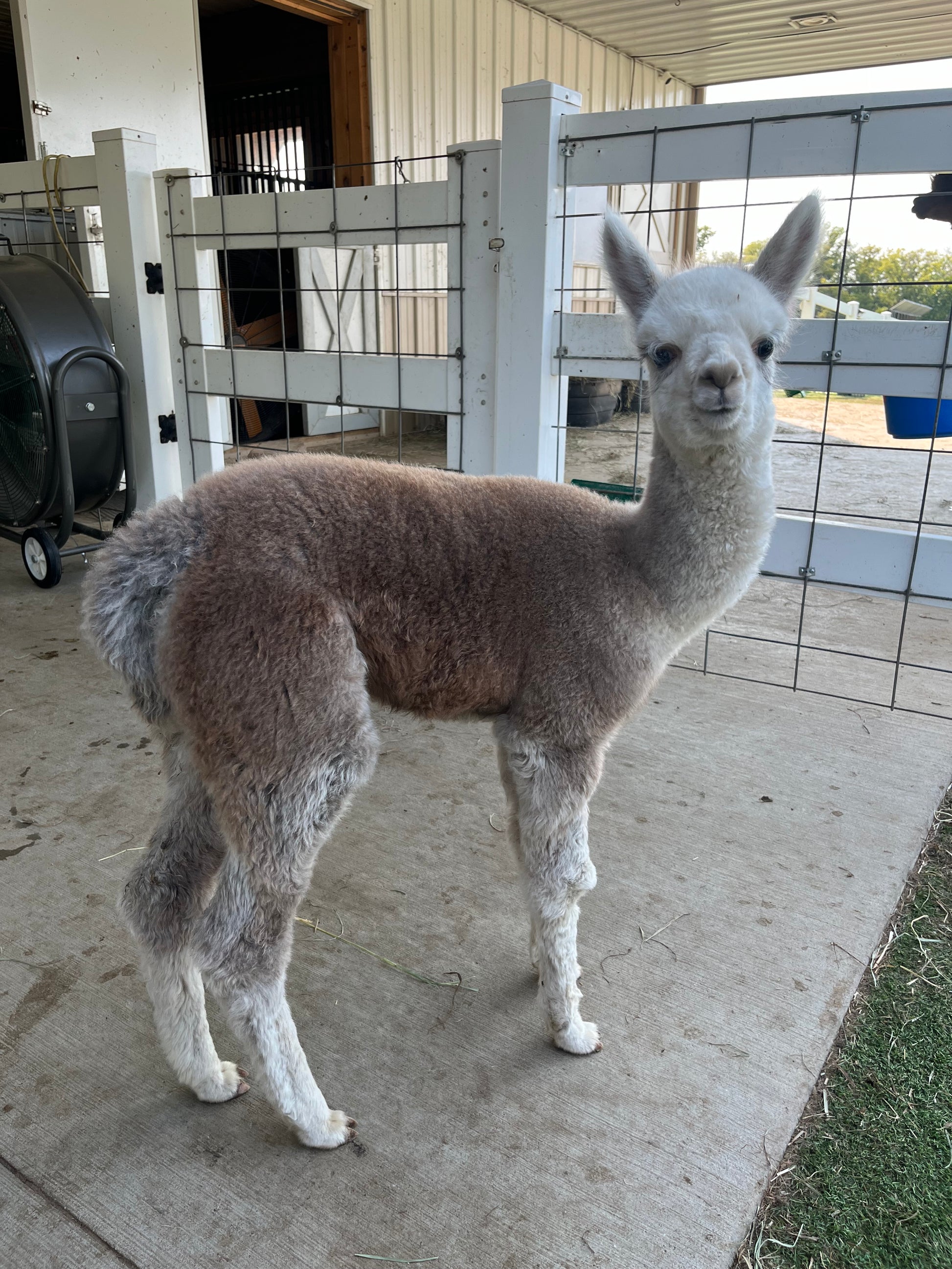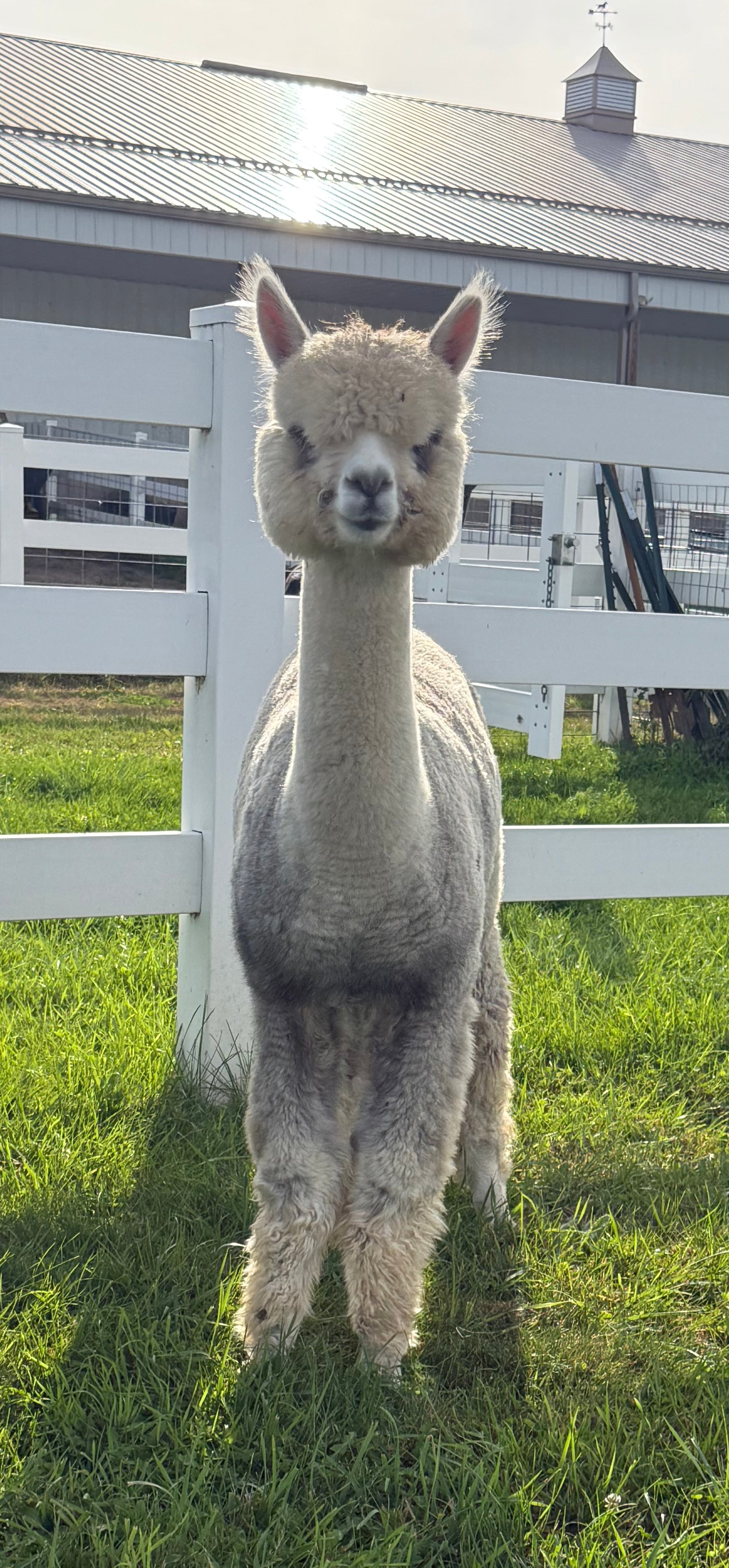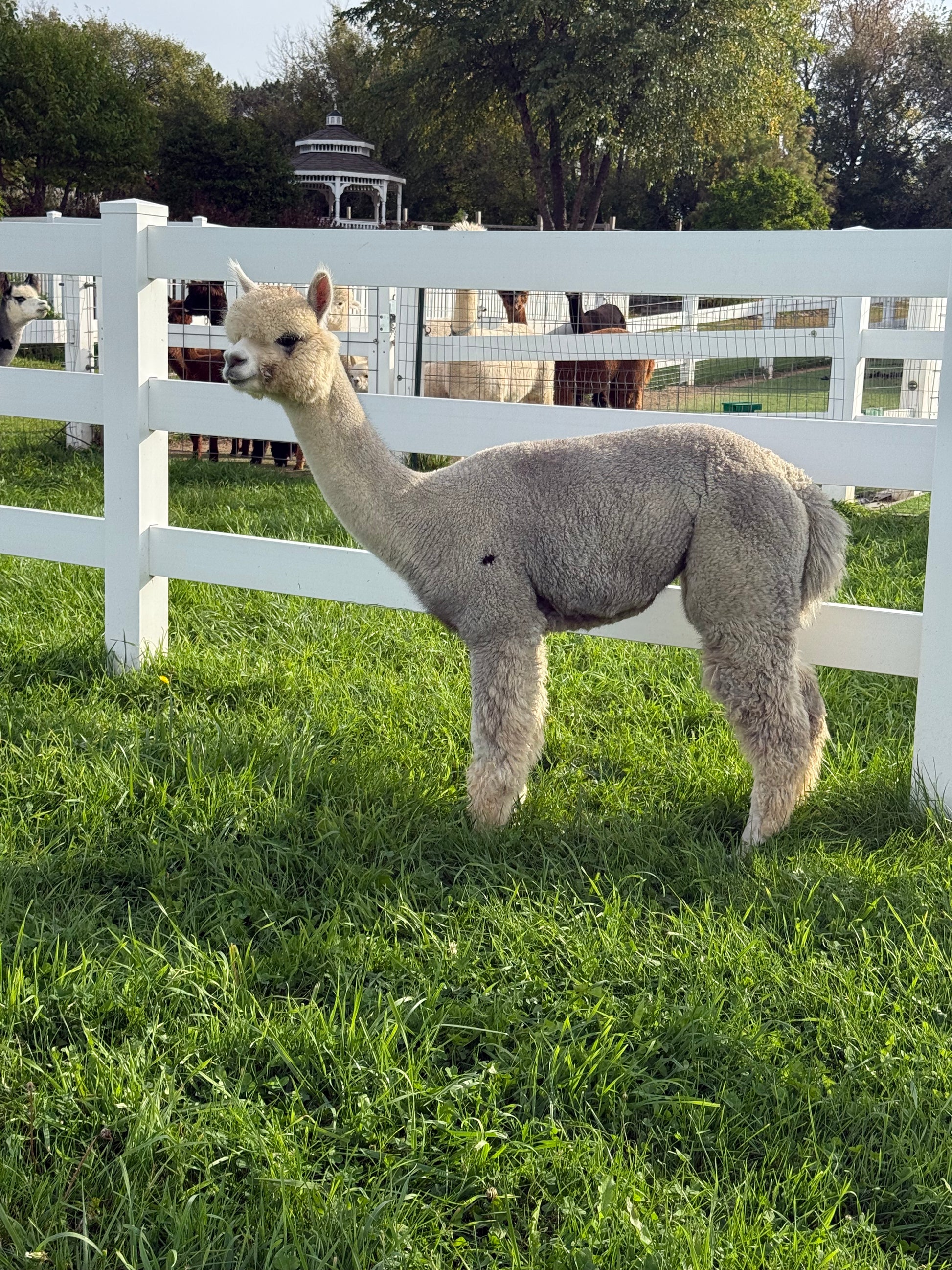 EEF Aggie had a difficult time at birth. She hung her head and then would all of a sudden flop over. We did a maneuver on her and after a few days she recovered. Since then, she is unstoppable. She loves to run and frolic. Her fleece is fine. She is a beautiful girl.