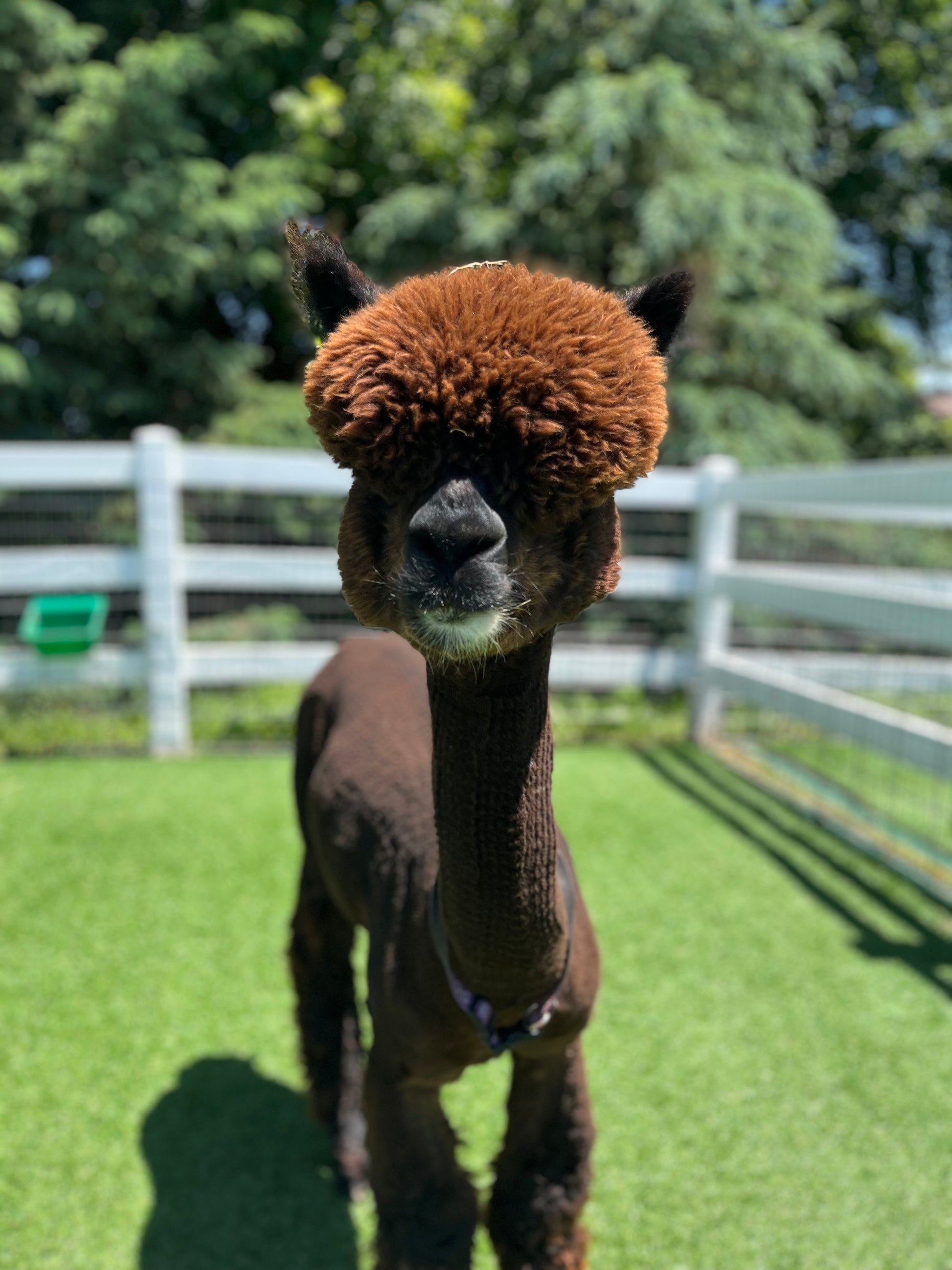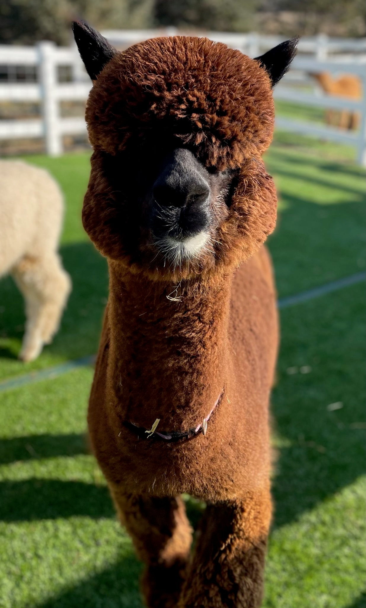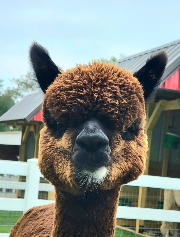 Rogue is one handsome guy! Rogue had failure of passive transfer of immunity from his mom when he was born. He became extremely ill and had to have two llama immunoglobulin transfusions within his first week of life. He had a rough start to life, but is full of love. He is starting to come into his own. His fleece is so crimpy. At shearing just before his first birthday, we were asked if we had given him a perm. He has a distinguishing little white soul patch, but no white fibers on his blanket. His mom, Wild, is very protective of him. Rogue is a farm favorite and has a forever home at Eagle Eye Farm.