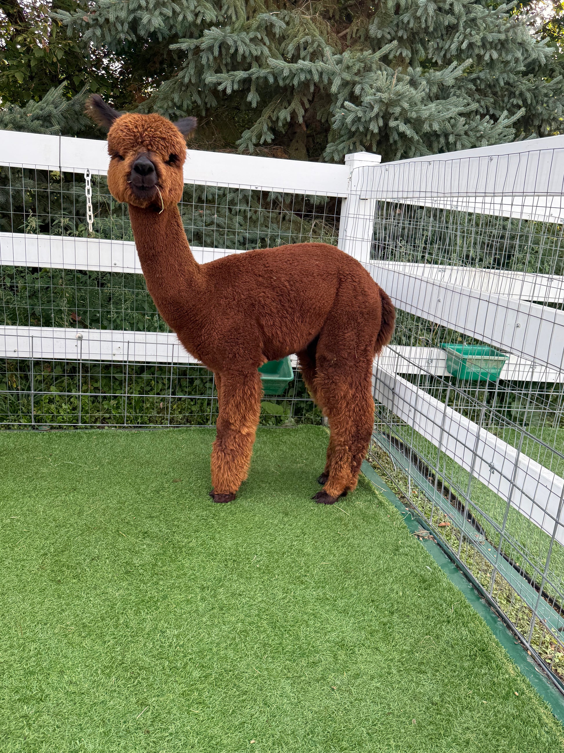 EEF Max Is Back is definitely a mama's boy as a cria. But he has stunning looks with beautiful brown fleece. He is named after EEF Max, another 2024 cria, which we unfortunately lost shortly before Max is Back was born. We are excited to see this boy grown up and hopefully start a new adventure soon.