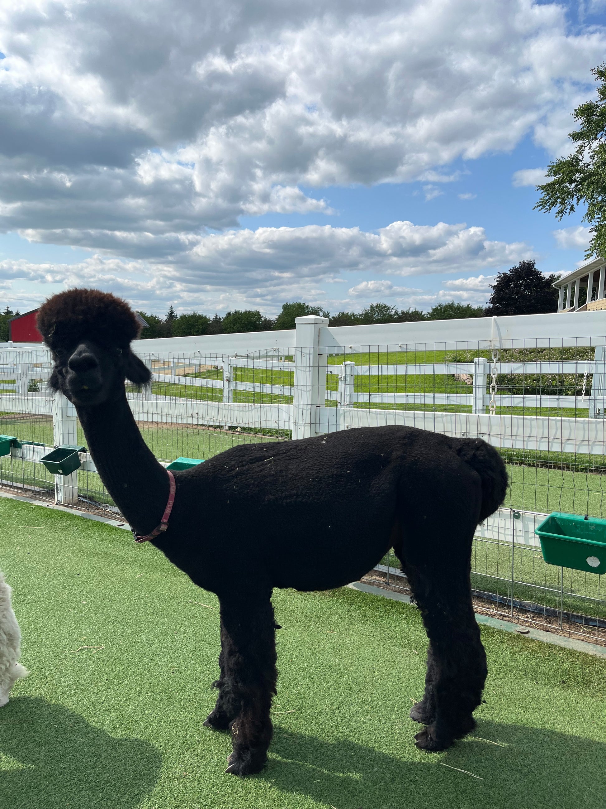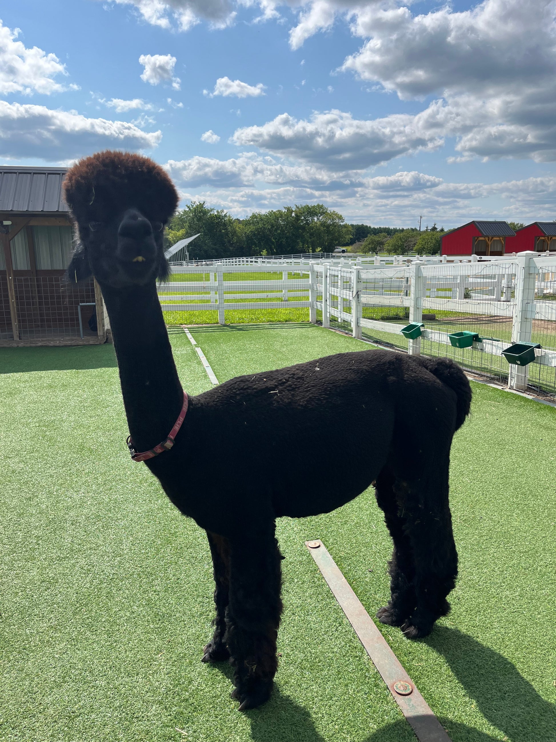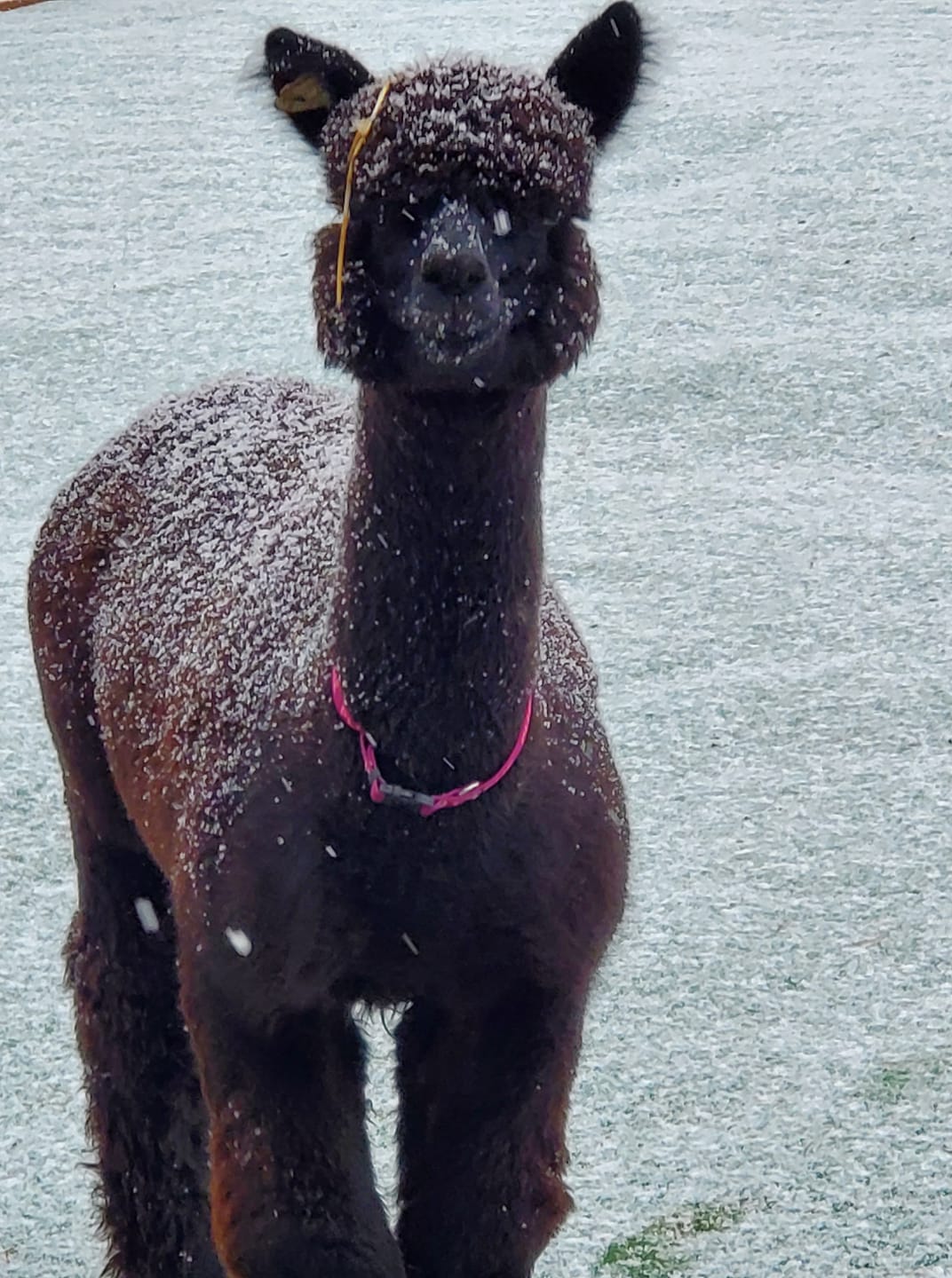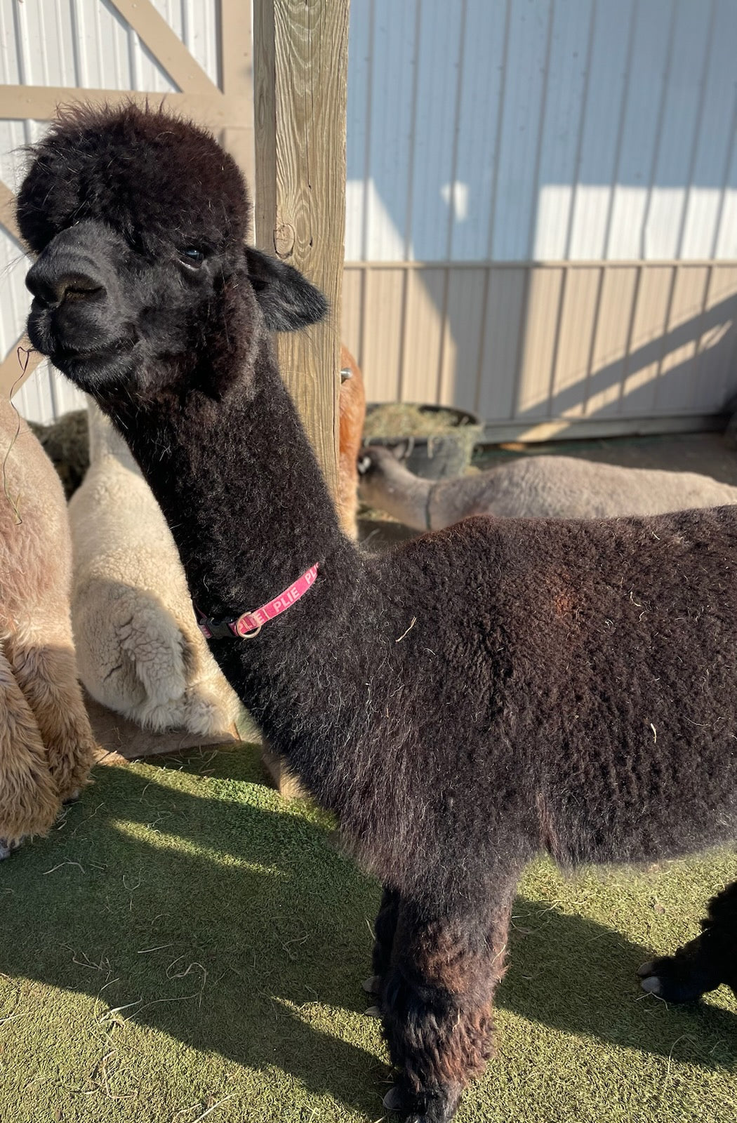 She has had three cria. The first was Pannache, which just sold to a farm in Minnesota. Pannache's fleece was too fine and she did not do well. Her second cria was sired by Challenger. This is EEF Folklore. Judges love her fleece. She was born later in the year and needs to grow up. Plie was then bred to EEF Going Rogue, 45 time Champion. She had a cute little black alpaca in 2024, Pirouette. $5,000